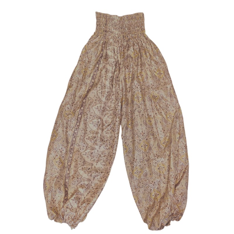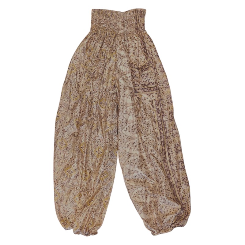 Da sarierne som bukserne er produceret af, er genbrugte, kan vi ikke garantere den præcise sammensætning af materialet i hver enkelt par bukser. De fleste indeholder en del mængde silke og ofte 100%, men kan også indeholde syntetiske fibre og være en blanding. Selvom vi foretrækker at undgå kunststoffer, mener vi stadig, at genbrugte sarier er et bæredygtigt valg, da stoffet får nyt liv i stedet for at gå til spilde.